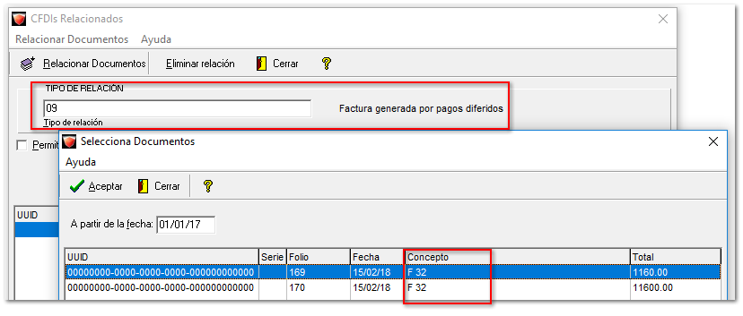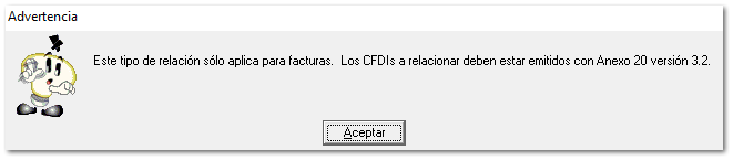 Al intentar poner este tipo de relación 08 o 09 en documentos que son diferentes a factura, se mostrará el siguiente mensaje de advertencia, permitiendo continuar con su captura y dejando al usuario que determine el tipo de relación a utilizar.