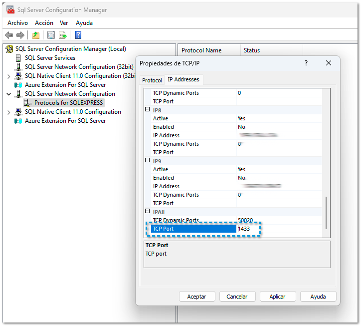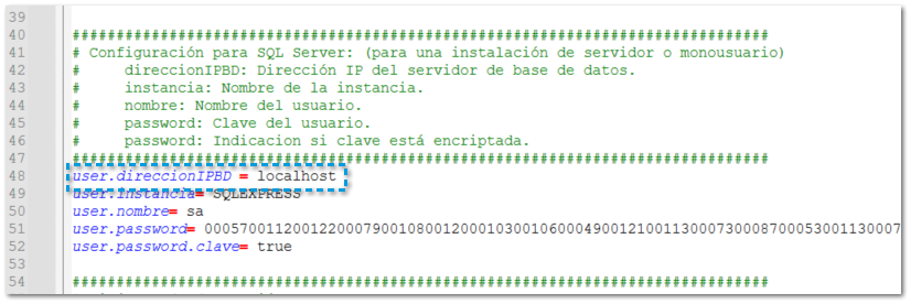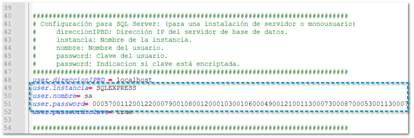Dirígete al apartado Configuración para SQL Server y agrega la siguiente línea: