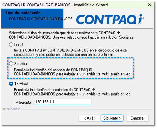 Realiza la instalación del sistema de CONTPAQi Contabilidad® y/o CONTPAQi Bancos® como servidor, indicando mediante el asistente de instalación que no se desea instalar SQL Server.
