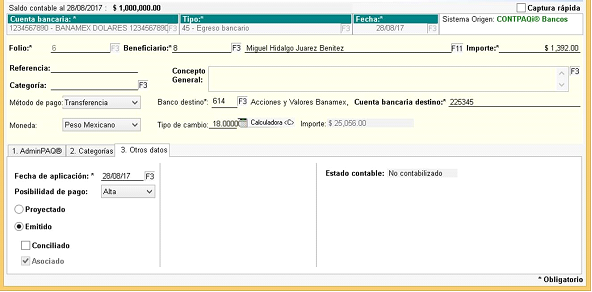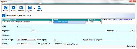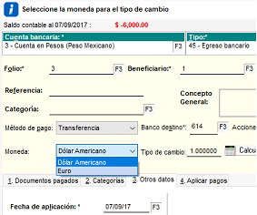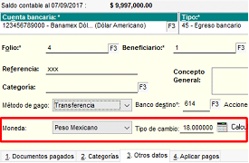 Dentro de la captura del documento, al seleccionar una cuenta bancaria en moneda extranjera, el sistema buscará el tipo de cambio correspondiente a la fecha del documento, si existe tipo de cambio, este será el asumido para el documento, con el comportamiento que se describe a continuación: