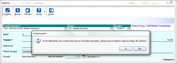 En caso de No encontrar tipo de cambio contable para la moneda de la cuenta bancaria y la fecha del documento, el sistema te dará la opción para capturar el tipo de cambio contable correspondiente a la fecha del documento.