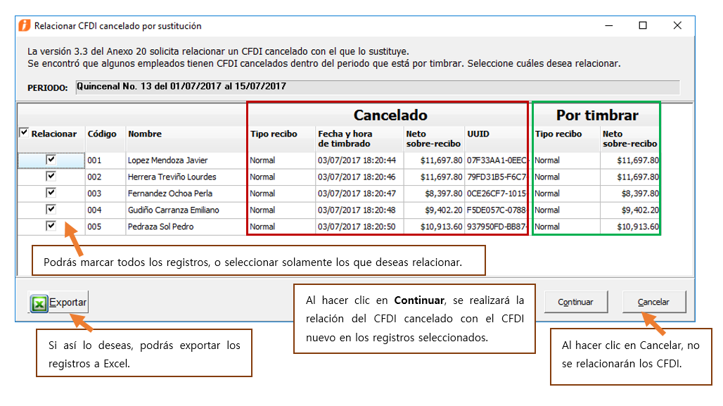 Al realizar el proceso de Emisión de recibos electrónicos, si se detecta que hay recibos de nómina de empleados que tienen un CFDI cancelado dentro del periodo, el módulo “Relacionar CFDI cancelado por sustitución” mostrará dichos registros, para que determines si deseas que se relacione con el CFDI que está por timbrar: