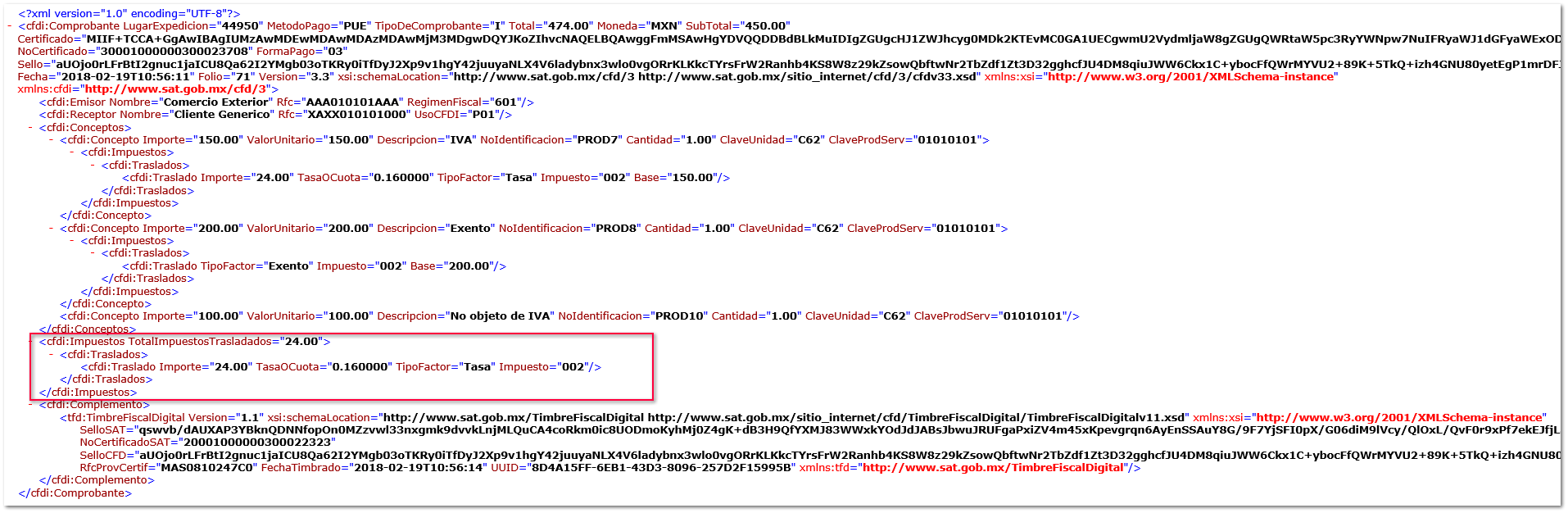 En el XML visualizaremos que los impuestos trasladados solamente se mostrará en correspondiente al producto que si tiene IVA.