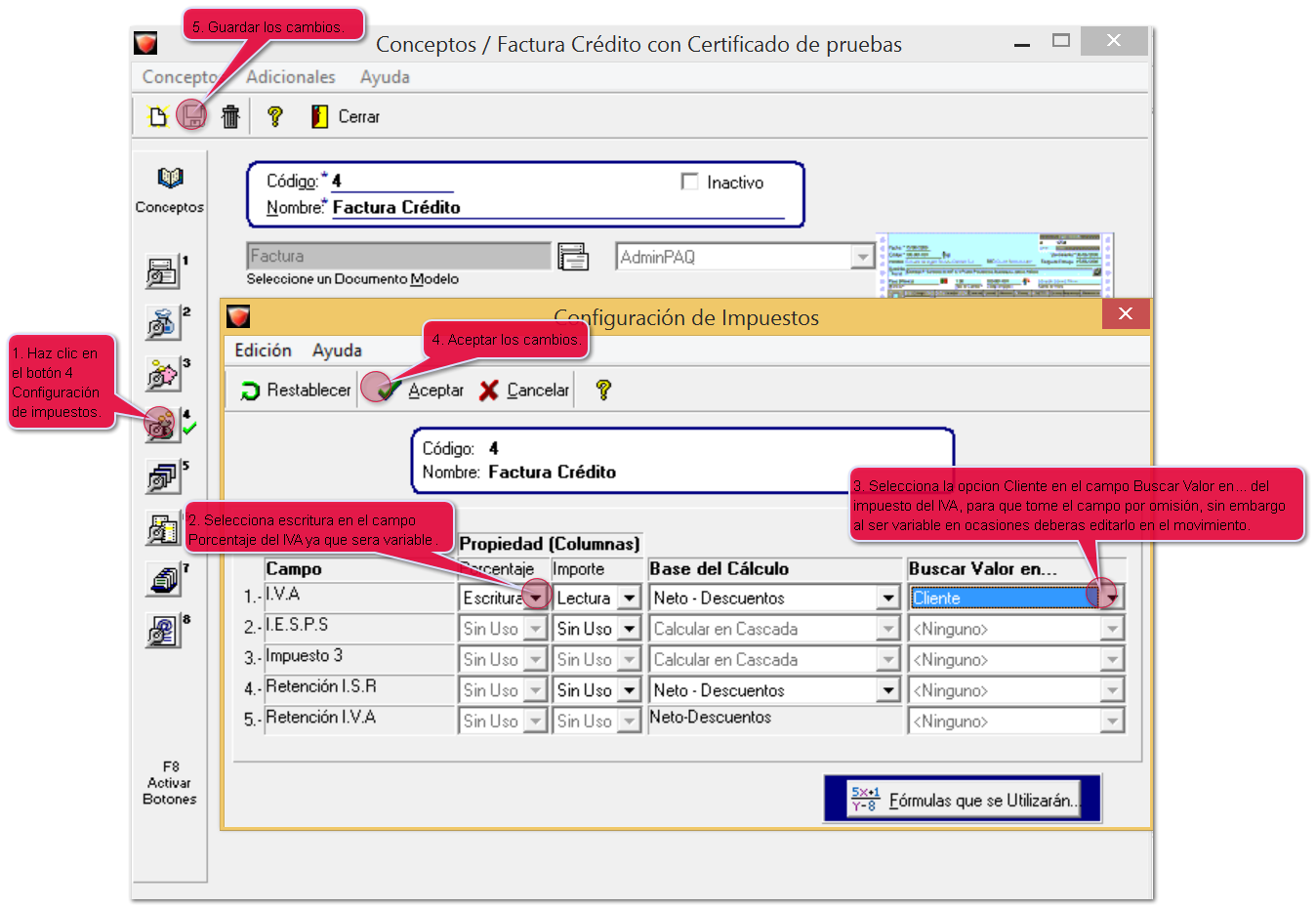 Dentro del catálogo de conceptos, selecciona el concepto de factura que utilizas para capturar tus documentos e ingresa al botón 4. Configuración de impuestos para asignar de donde tomara el IVA.