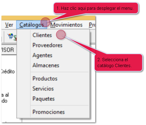 Ingresa al menu Catálogos y posteriormente al submenu Clientes.