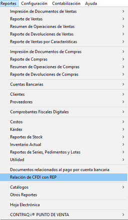 A partir de esta versión, al ejecutar el reporte Relación de CFDI con REP el sistema mostrará TODAS las facturas timbradas indicando si tiene un pago relacionado o no y mostrando los estados de los Recibos Electrónicos de Pago.