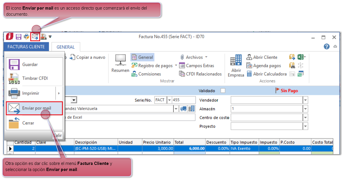 Abre el documento que necesitas enviar y y haz clic sobre el icono del sobre. Otra opción ingresar al menu del documento y hacer clic en Enviar por mail.