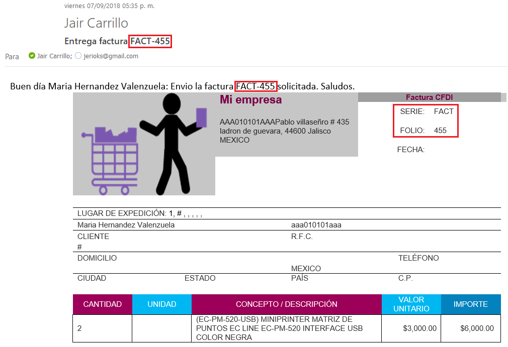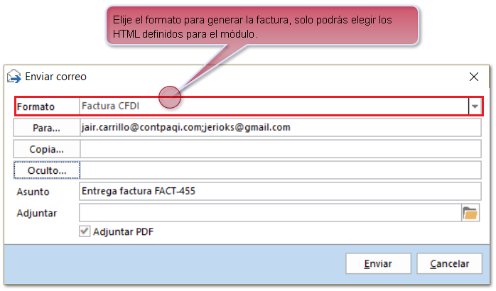 La factura se anexará al cuerpo de correo como HTML
