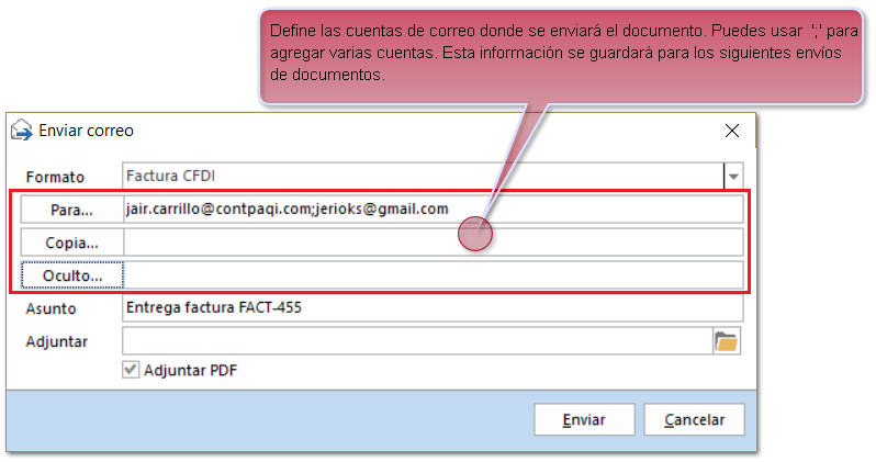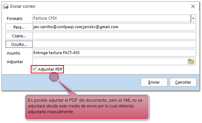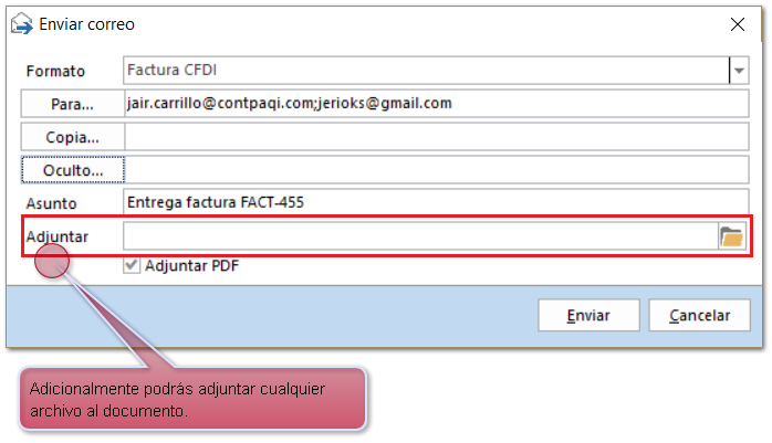 Posteriormente se abrirá la venta de Enviar correo con los siguientes campos: