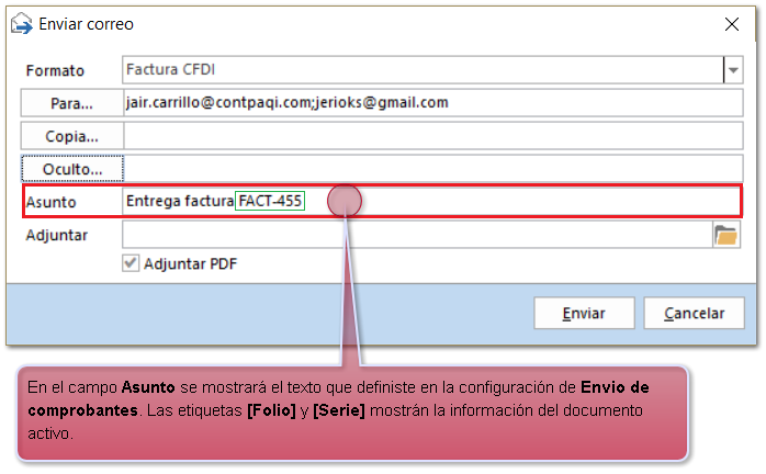 Este medio de envio solo toma las etiquetas [Cliente], [Serie] y [Folio].