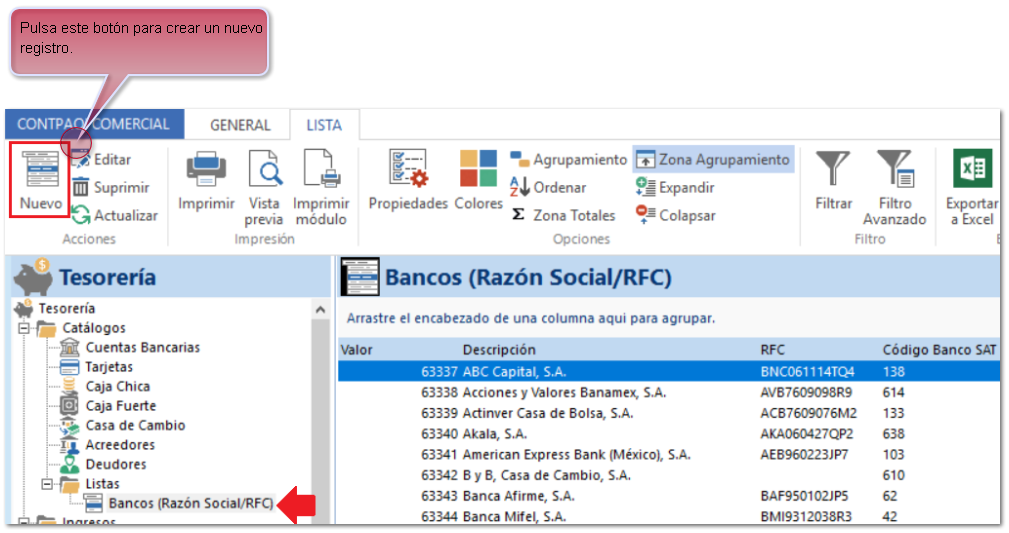 Ingresa al módulo Bancos que se encuentra en la sección Tesorería, posteriormente haz clic en el botón Nuevo.
