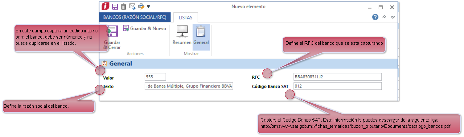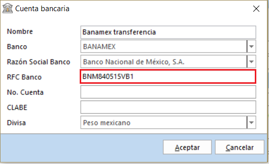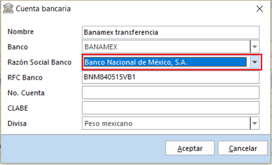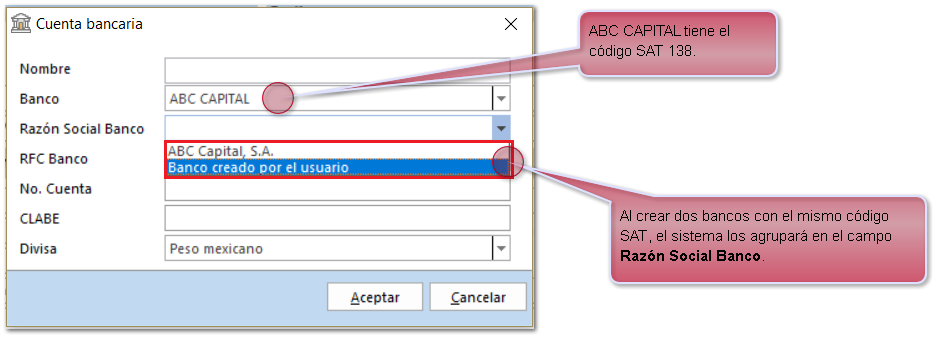 Si dos Bancos tienen el mismo Código Banco SAT, se mostrarán en el listado de Razón Social Banco al capturar una nueva cuenta bancaria del cliente.