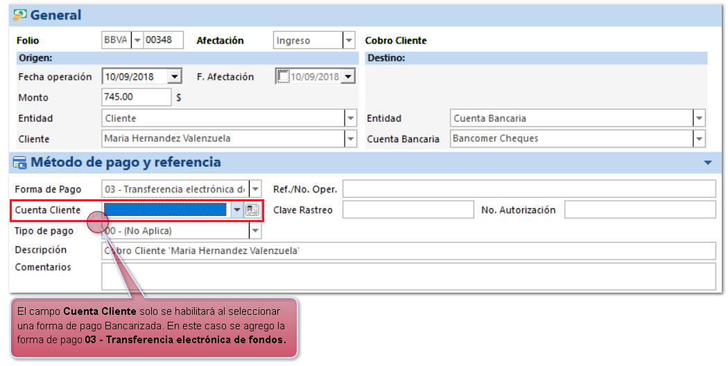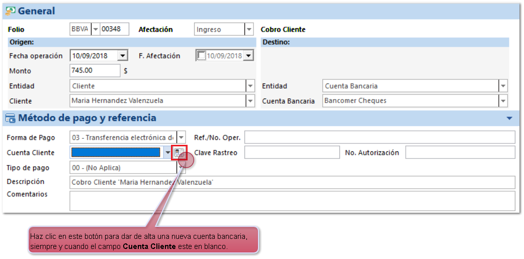 ![]() Al capturar un Cobro Cliente y definir una forma de pago Bancarizada podrás observar el campo Cuenta cliente.