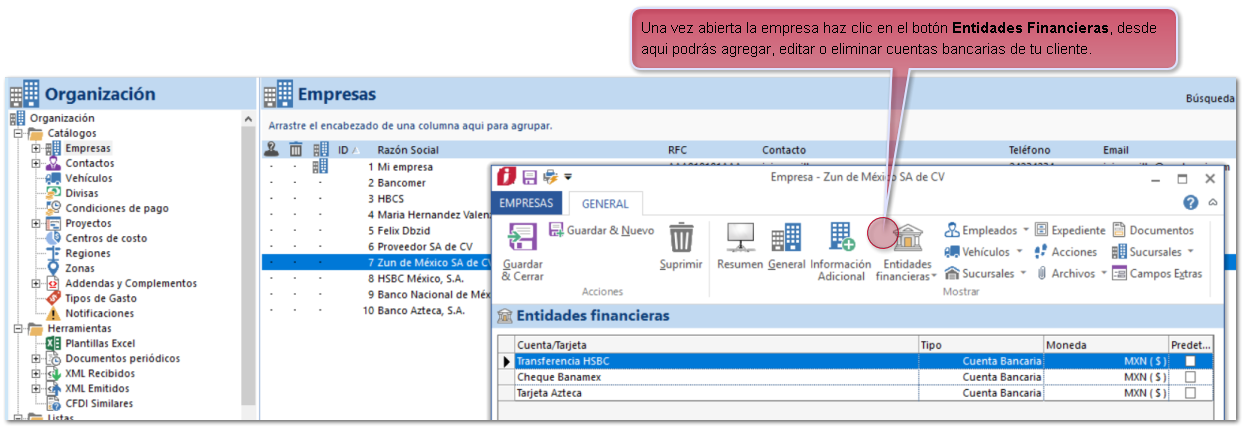 Otra opción para revisar y editar las cuentas bancarias de los clientes es ingresando a la sección Organización - modulo Empresas y abrir la empresa. El botón Entidades Financieras mostrará la información de las cuentas.