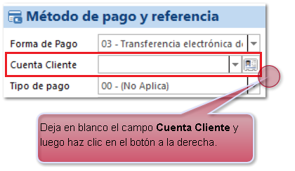 Para crear una nueva cuenta bancaria al cliente selecciona una forma de pago bancarizada, deja en blanco el campo Cuenta Cliente y haz clic en el botón que se muestra a la derecha.