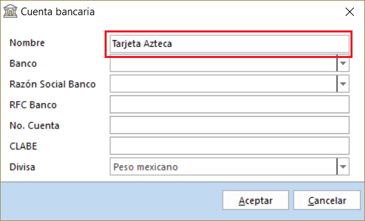 ![]() Se mostrará una ventana para que registres la nueva cuenta bancaria. Registra el nombre que identificará a la cuenta bancaria.