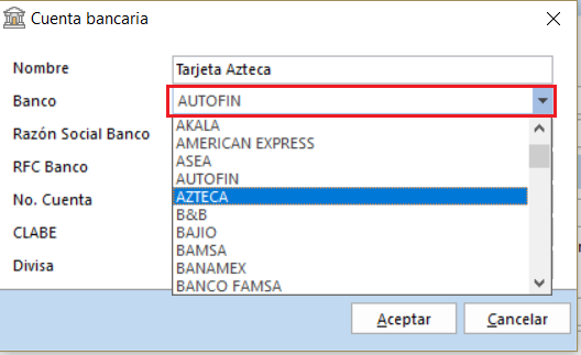 ![]() Selecciona el Banco de la cuenta bancaria, se listará un catálogo precargado.