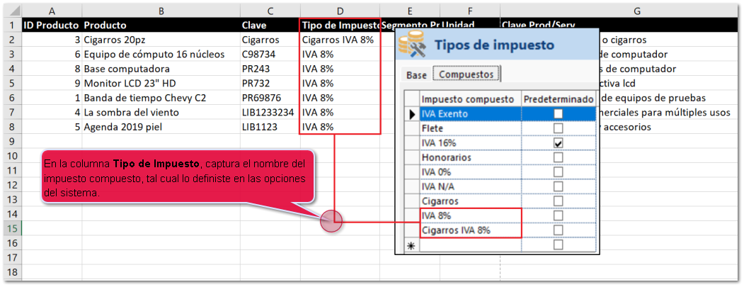 Se abrirá una hoja de Excel con la información de tus productos. Modifica la columna Tipo de Impuesto, con el nombre del impuesto Compuesto con tasa del 8% de IVA.