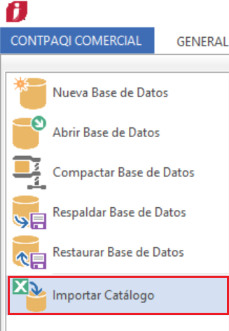 En CONTPAQi® Comercial Start/Pro ingresa al menu CONTPAQI COMERCIAL y selecciona Importar Catálogo