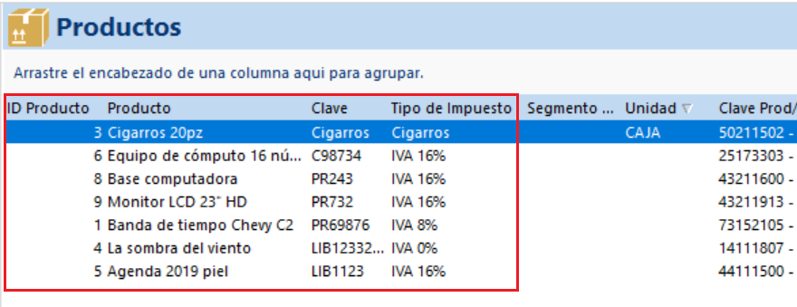 Desde el botón Propiedades, opción Campos, muestra la columna Tipo de Impuesto y como recomendación ordena al principio las columnas ID Producto, Producto, Clave y Tipo de Impuesto como se muestra en la siguiente imagen.