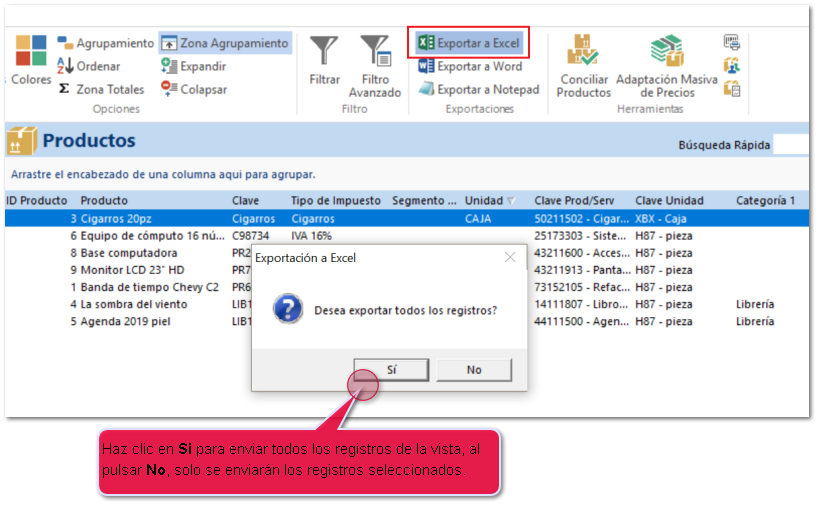 Haz clic en el botón Exportar a Excel para enviar todos los registros de la vista a Excel, valida que el filtro aplicado a la vista muestre la información que necesitas.