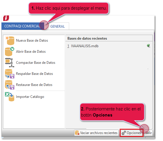 Por omisión CONTPAQi® Comercial Start/Pro ya tiene la tasa de IVA AL 16% configurada por omisión, por lo que solo debes validar dicha configuración en el menu CONTPAQI COMERCIAL / Opciones.