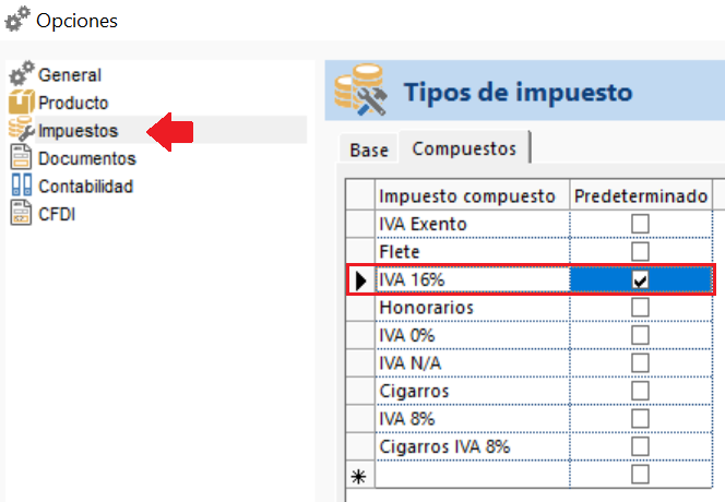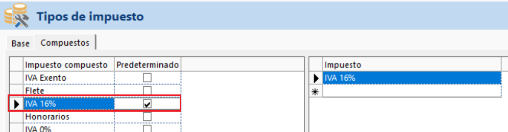 En la pestaña Compuesto ya se tiene el impuesto compuesto de IVA 16% como predeterminado.