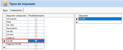 Si deseas predeterminar el IVA al 8%, deberás crear el impuesto base y el impuesto compuesto y solo marcar la casilla Predeterminado.