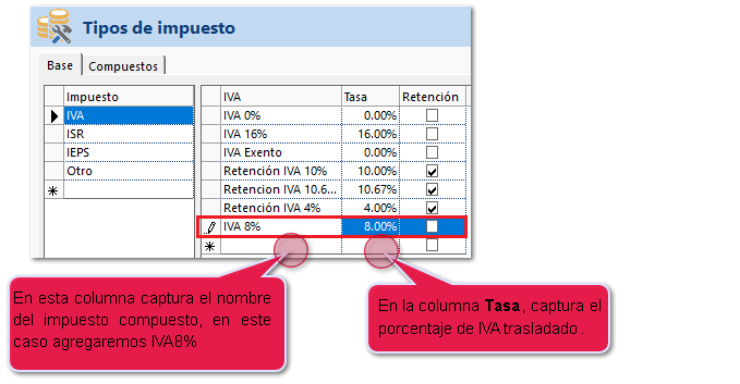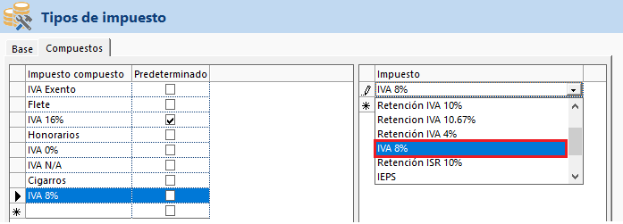 Selecciona la pestaña Compuestos, en el ultimo renglón agrega la leyenda IVA 8%.![]() Posteriormente, en la parte derecha sobre la columna Impuesto, despliega la lista y selecciona el impuesto base IVA 8%