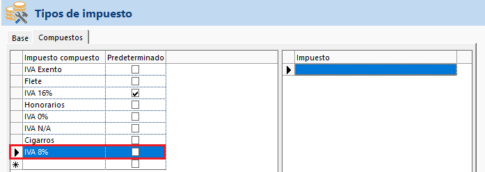 Haste este momento solo se dio de alta el impuesto Base IVA 8%, el cual podrás utilizar con los impuestos compuestos.