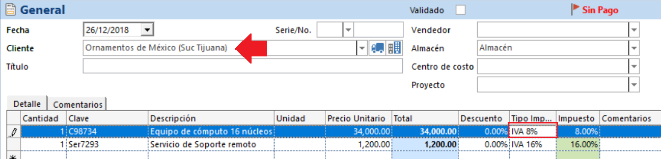 ![]() Si la operación es dentro de la zona fronteriza basta con crear el documento y definir la tasa del 16% IVA en el movimiento.