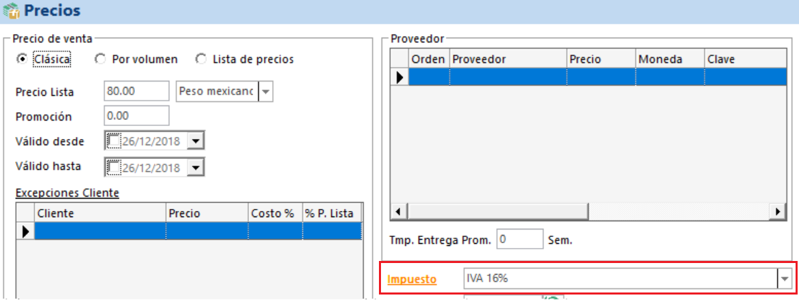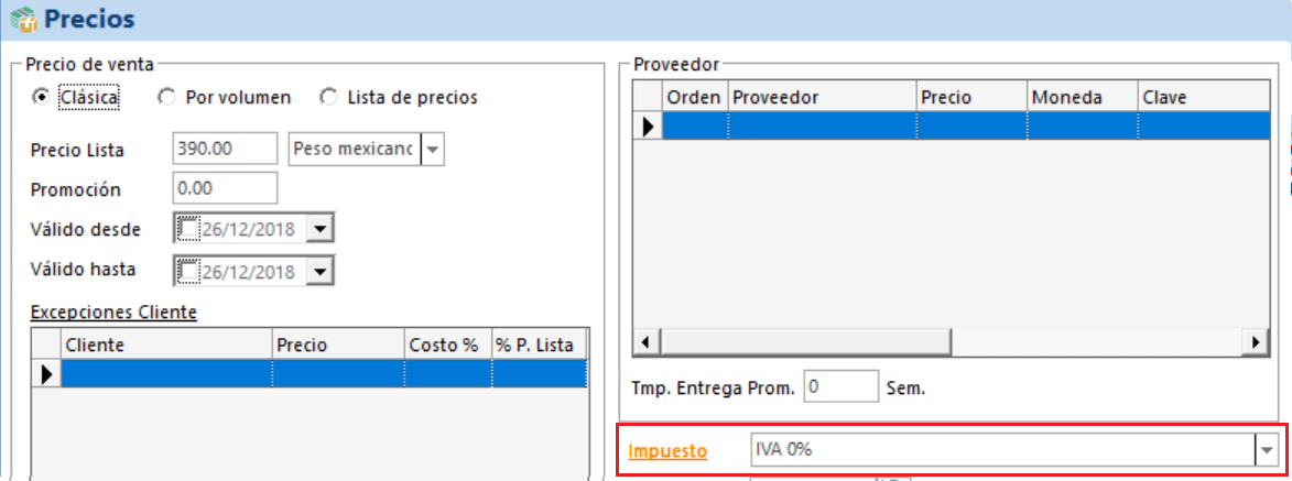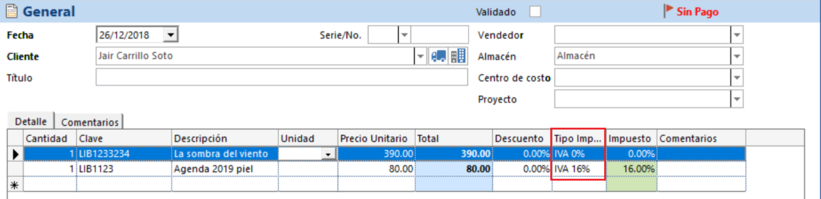 En el apartado Impuestos define el IVA al 0% y 16% a los productos que les corresponden.
