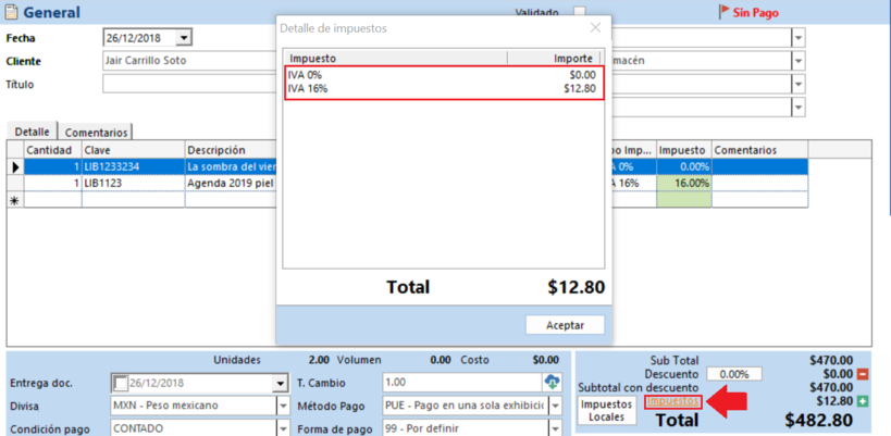 En la parte inferior, en la opción Impuestos, visualizaras los importes por cada tasa.