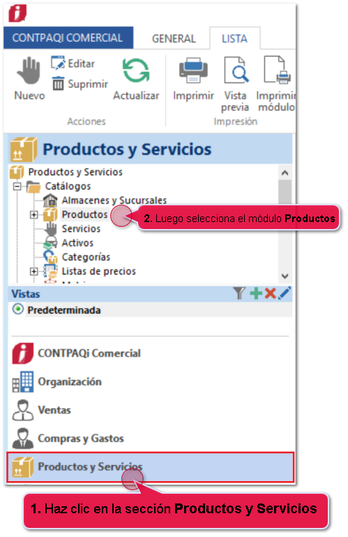 Ingresa a la sección Productos y Servicios, posteriormente haz clic en el módulo Productos.