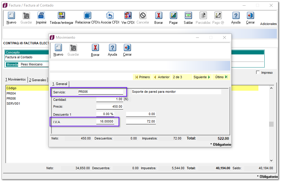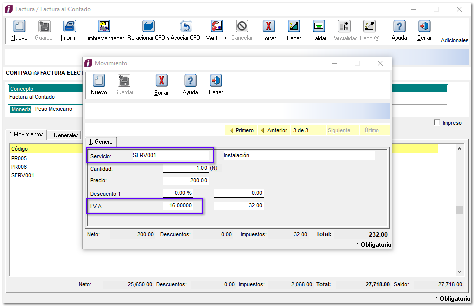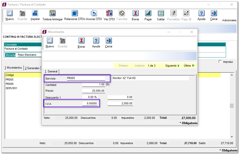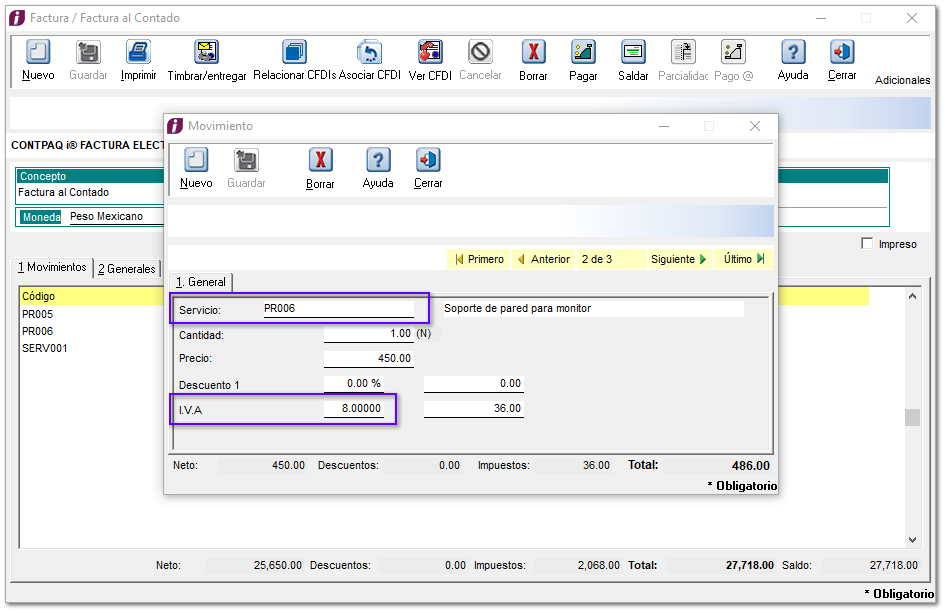 En el siguiente ejemplo; se emitirá la factura con productos a una tasa de IVA al 8% y el servicio a una tasa de 16% de IVA.