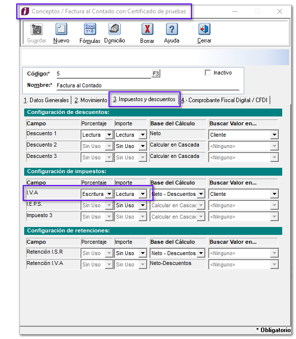 Dentro del catálogo de conceptos, selecciona el concepto de factura que utilizas para capturar tus documentos e ingresa a la pestaña 3.Impuestos y descuentos.