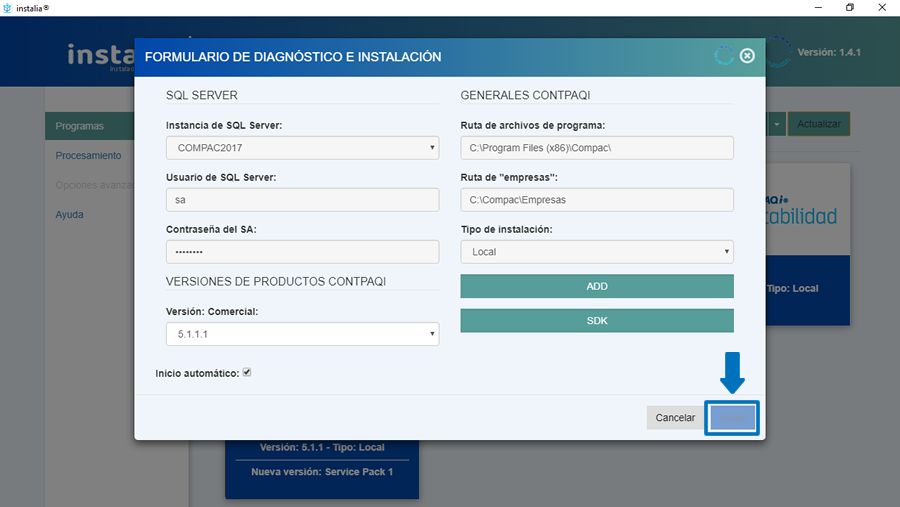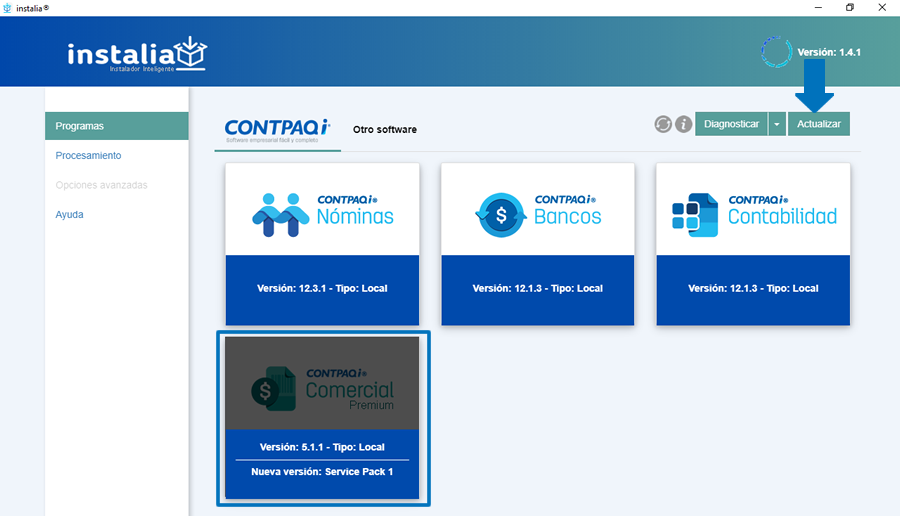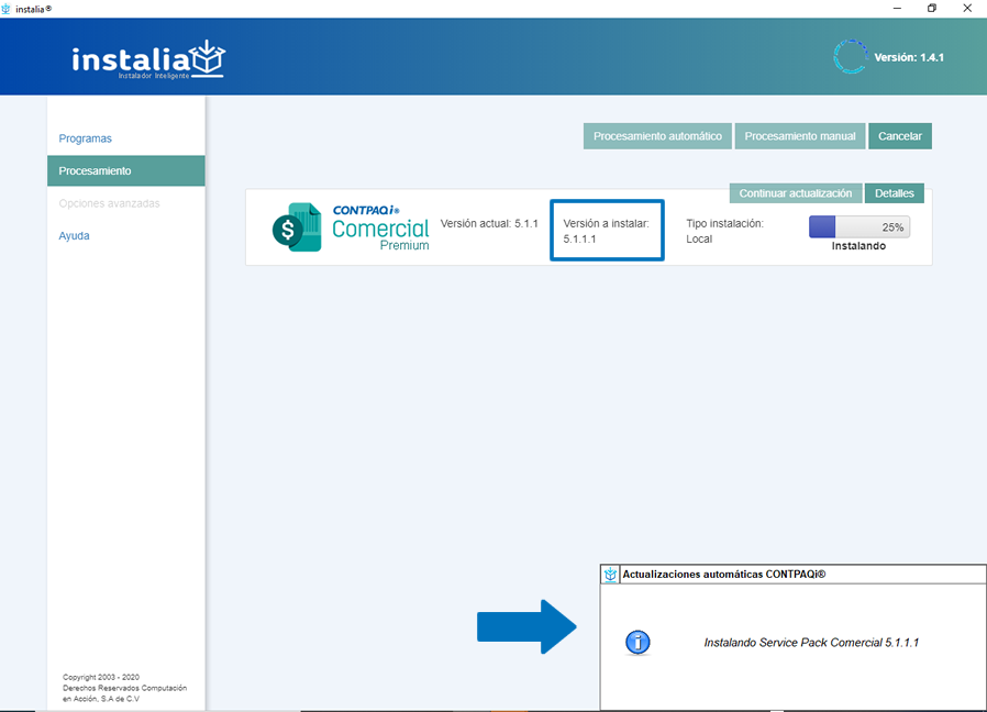 A partir de la versión 1.4.1 de instalia®, laactualización de Service Pack de CONTPAQi® Comercial premium se realizade forma independiente.