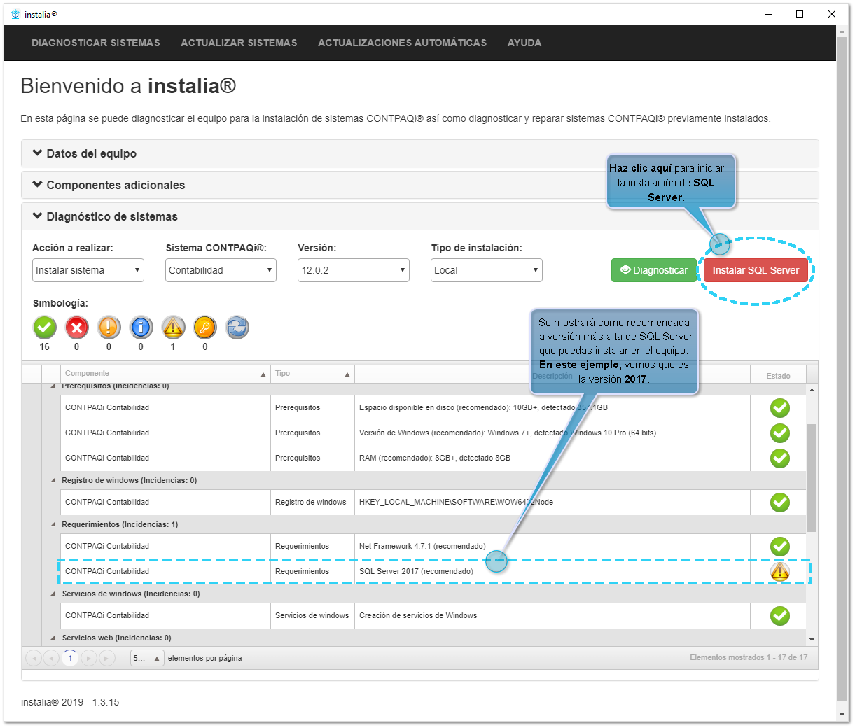 Cuando instalia® diagnostica que el equipo no tiene instalado Microsoft® SQL Server®, dentro de la sección de Requerimientos verás este icono para el componente SQL Server y se habilitará en botón Instalar SQL Server.