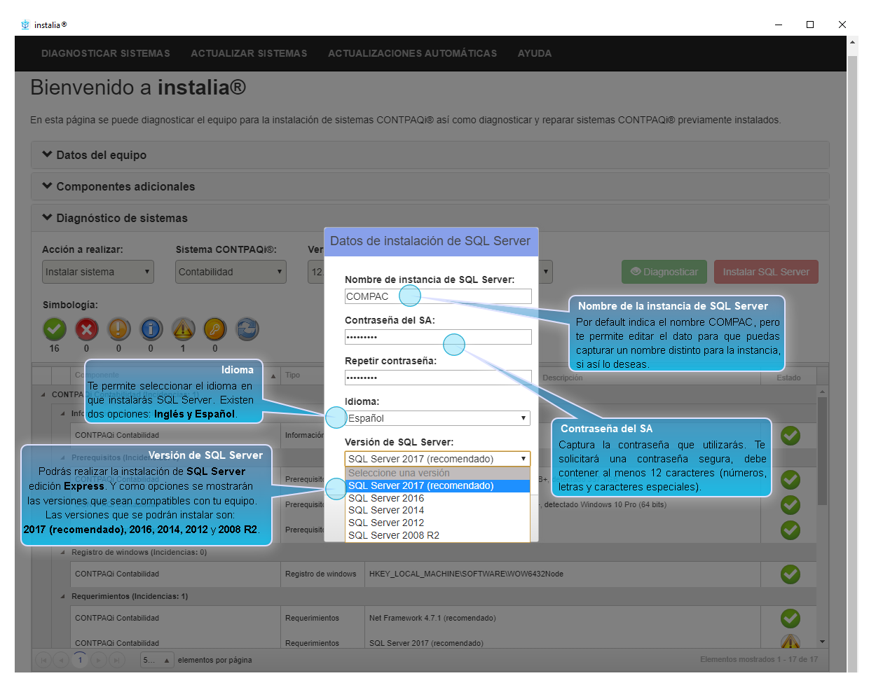 instalia® te dará la posibilidad de instalar Microsoft® SQL Server® edición Express con la versión 2017 (recomendado), 2016, 2014 o 2012, dependiendo de las características de tu equipo.