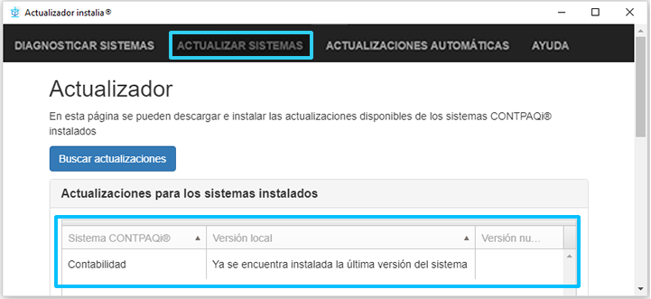 Si ya tienes instalada la versión más reciente del sistema CONTPAQi®, al ingresar a la opción ACTUALIZAR SISTEMAS se mostrará esta información: