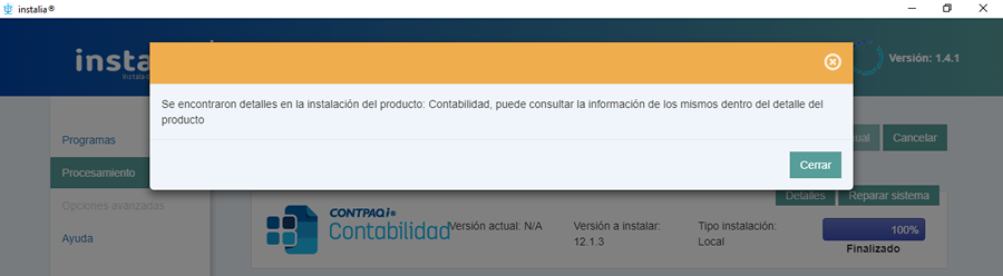 1. Al finalizar la instalación de CONTPAQi® Contabilidad y CONTPAQi® Bancos se mostrará un mensaje indicando que se presentaron errores: