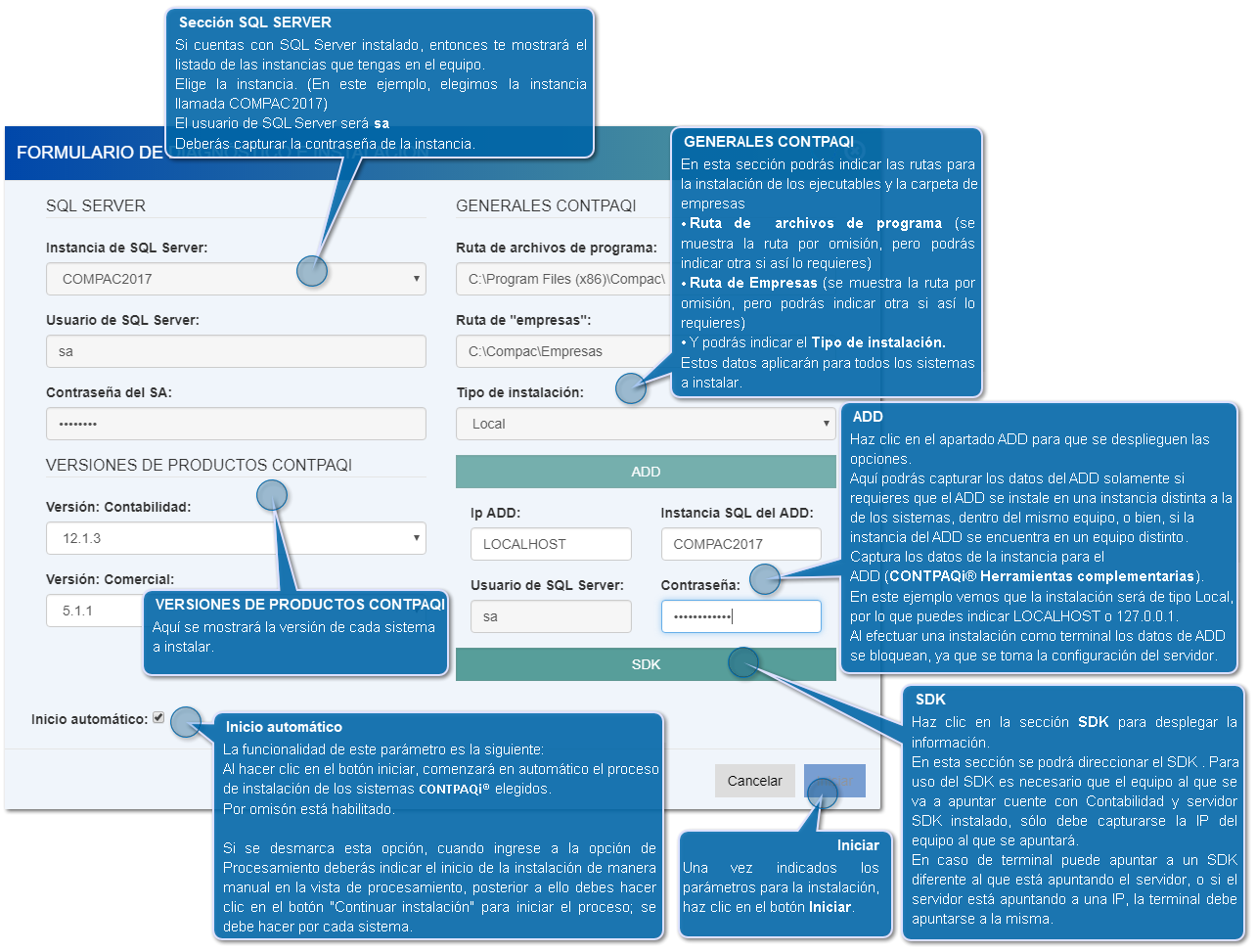 Se mostrará una ventana con el FORMULARIO DE DIAGNÓSTICO E INSTALACIÓN, donde deberás indicar los datos de instalación para los sistemas CONTPAQi® que elegiste instalar.