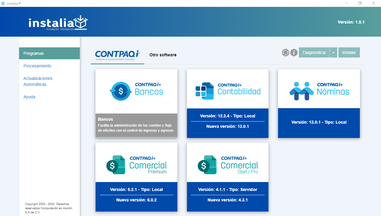 instalia® incorpora una interfaz similar a una página web, donde podrás realizar la instalación de los sistemas de una manera sencilla, además podrás identificar fácilmente cuando existen actualizaciones disponibles de los sistemas CONTPAQi®.