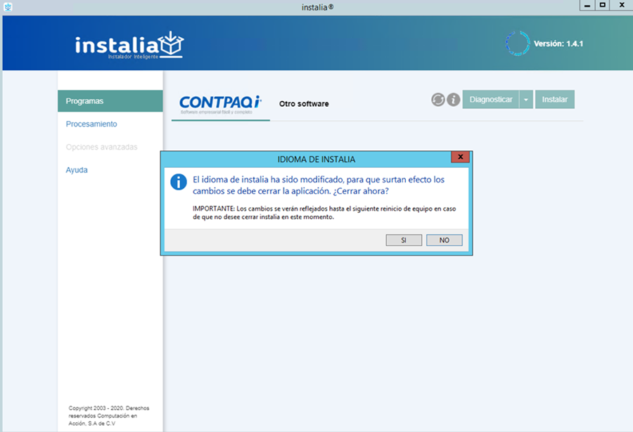Al hacer clic en "SI" se cierra instalia® de forma automática para que que se efectúen los cambios; al abrir nuevamente, los textos en la aplicación instalia® se mostrarán en inglés.