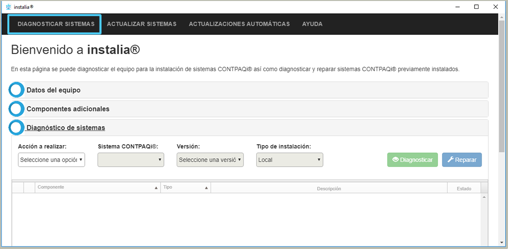 También podrás realizar el diagnóstico de los sistemas CONTPAQi® que ya se encuentran instalados en tu equipo y, en caso de existir algún error en la instalación o el entorno actual, se realiza la reparación.