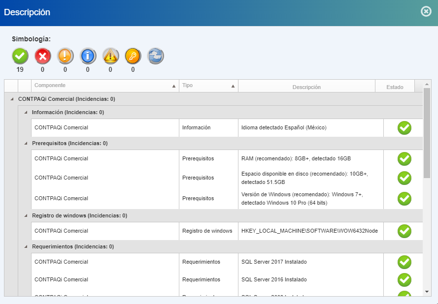 Se mostrará la información dividida en secciones: Información, Prerequisitos, Registro de Windows, Requerimientos, Servicios de Windows, Servicios Web y Sistema de Archivos; En estas secciones se detecta si hay errores, archivos corruptos, información, puertos cerrados por el firewall de Windows, falta de activación del sistema / error en el servicio.