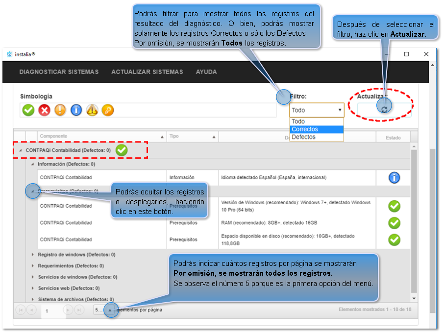Al realizar el diagnóstico, podrás utilizar el filtro para mostrar todos los resultados, solamente los registros correctos o sólo los defectos.