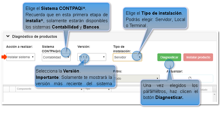 Elige el Sistema CONTPAQi® a instalar, la Versión y el Tipo de instalación.