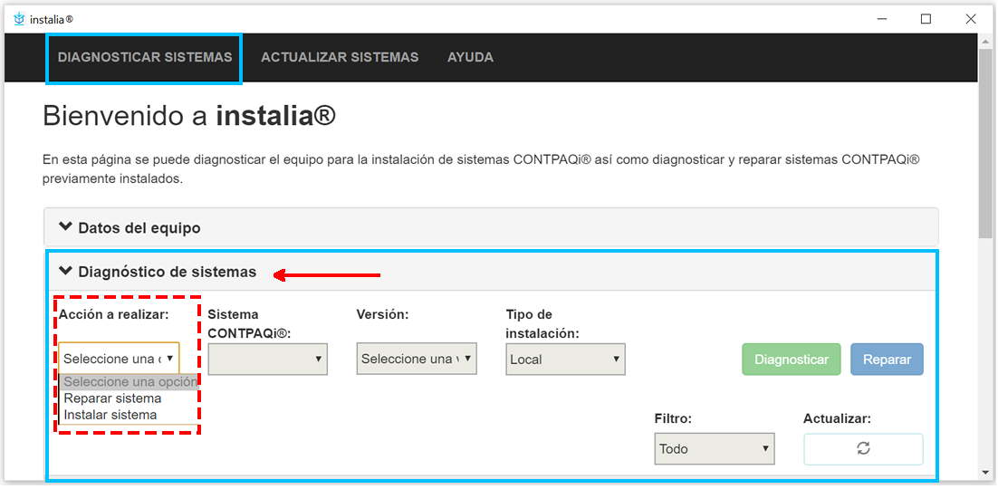 Desde esta sección se realiza el diagnóstico para la instalación y reparación de los sistemas CONTPAQi®.