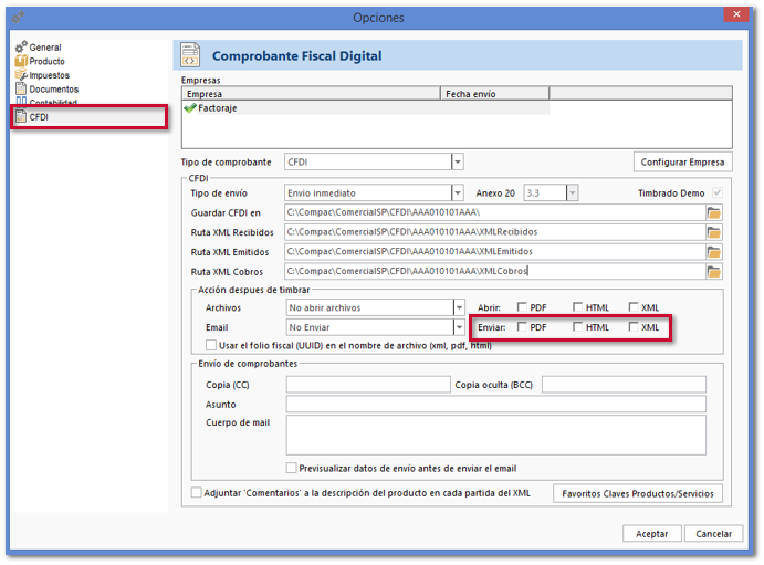 Ahora al realizar el envío de documentos por correo de los comprobantes CFDI (Facturas Cliente), se enviarán solamente los archivos que se tengan configurados en las Opciones de CFDI.